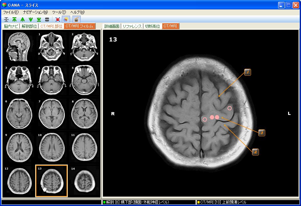 [CT/MRIフィルム] タブを開き、調べたいスライスをクリックし選択すると、[CT/MRI] タブに選択されたCT/MRI画像の拡大図が表示されます。 [CT/MRI] の画像中に描かれたピンク色の丸は運動経路(錐体路)、白抜きのピンク色の丸は大脳皮質運動野を示しています。